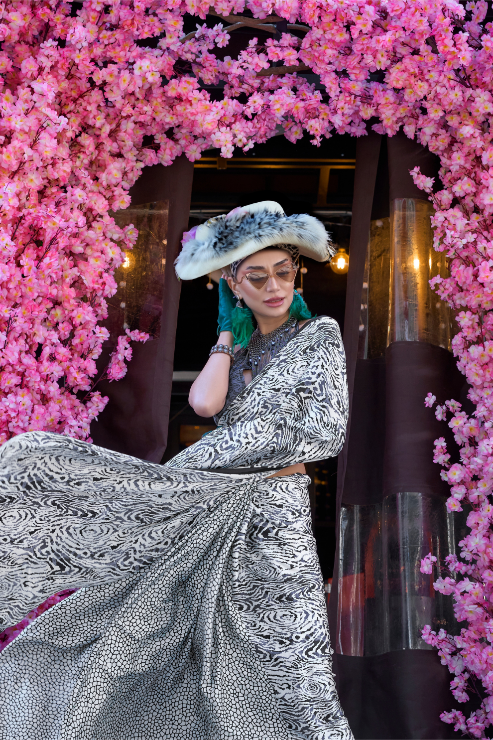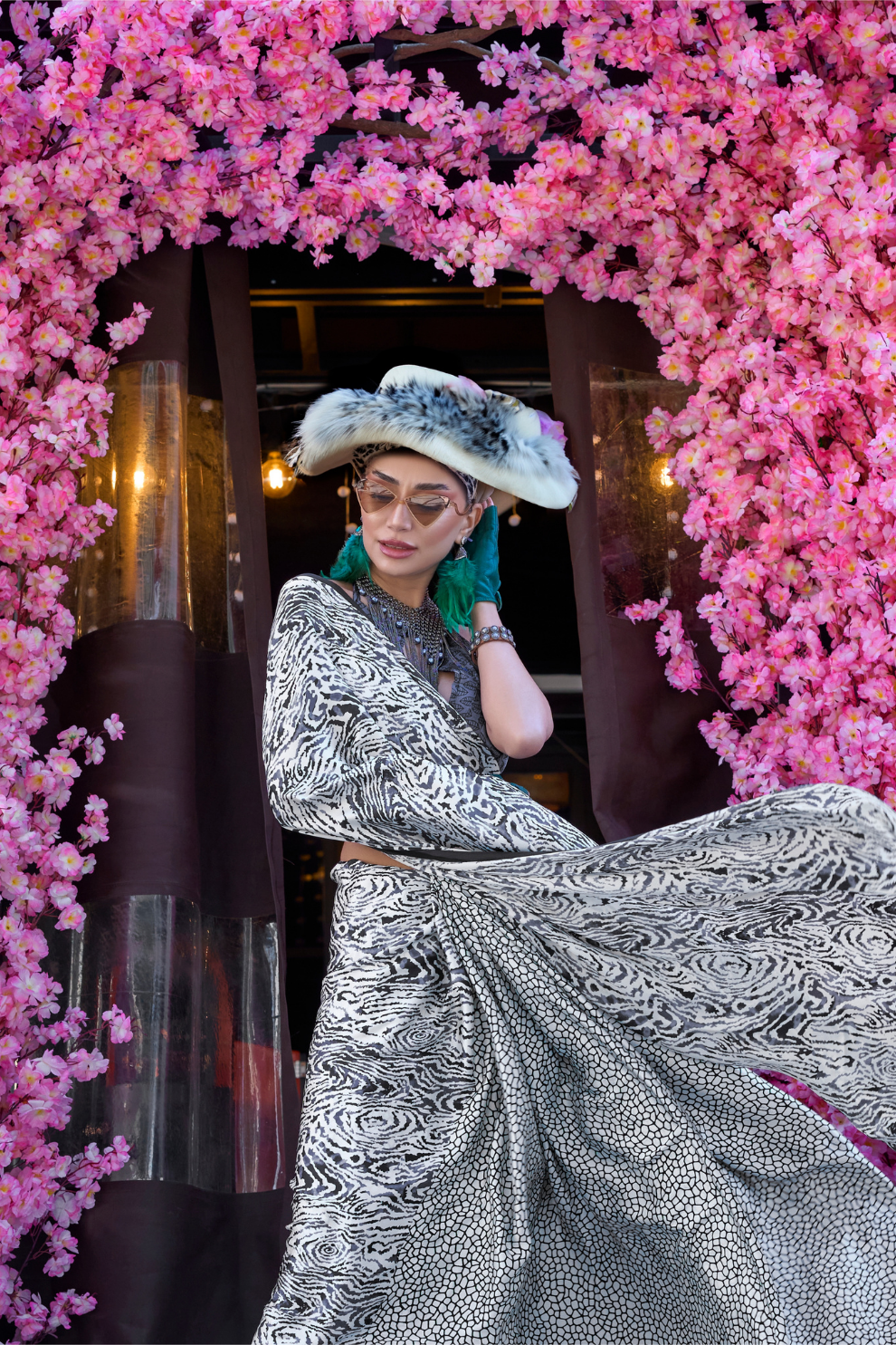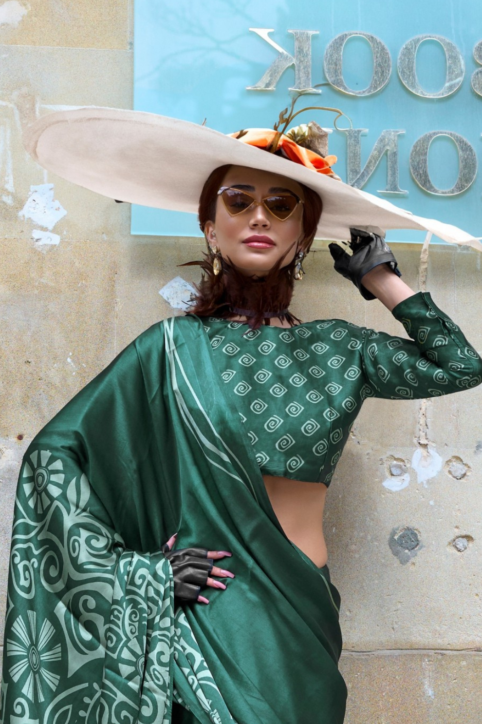 Contemporary Print Satin Crepe Saree with Chic Glossy Drape