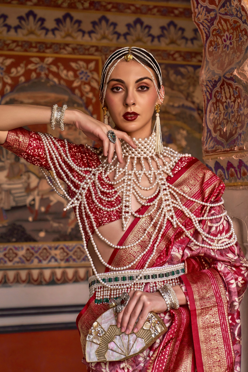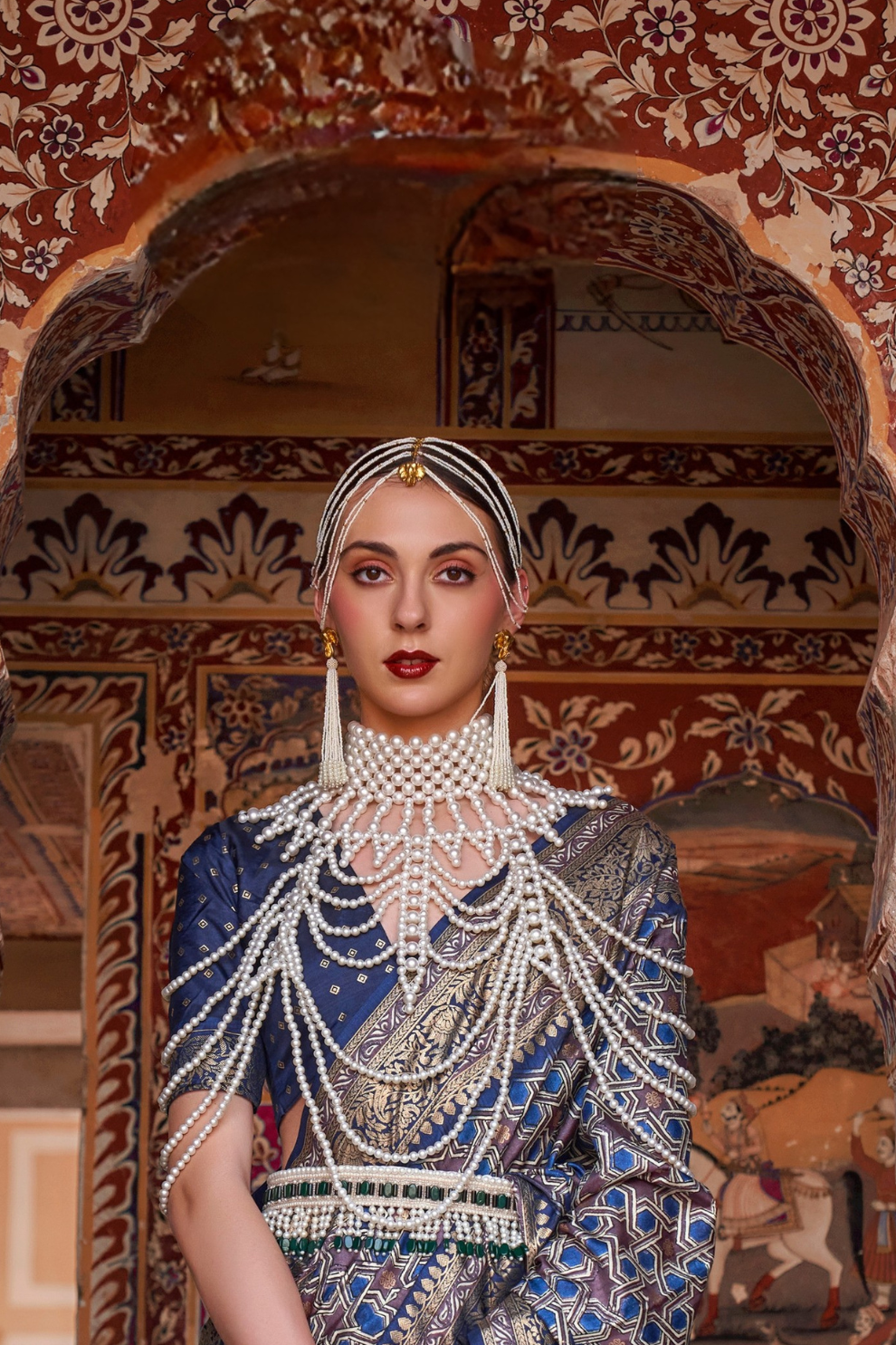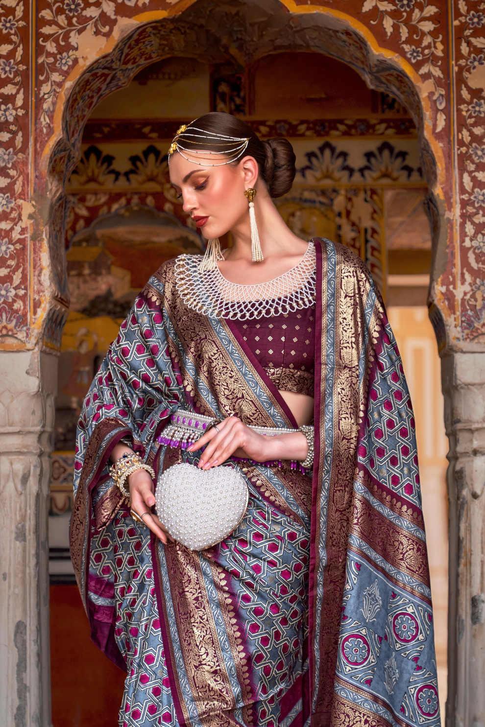 Designer Mercerized Silk Saree with Ajrakh-Batik Fusion and Golden Print