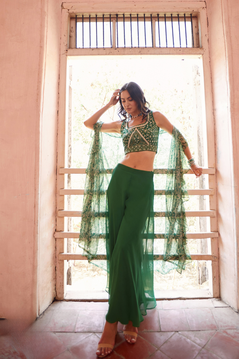 Elevate your style with this elegant Indo-Western ensemble featuring a vibrant green shrug and coordinating palazzo pants. The lightweight shrug adds a graceful flow, while the palazzo ensures comfort and ease of movement. Perfect for festive gatherings, casual outings, or semi-formal events, this outfit combines tradition with a modern twist. Subtle detailing enhances its appeal, making it a standout choice for fashion-forward wardrobes. Designed with care by LaVante Fashion.