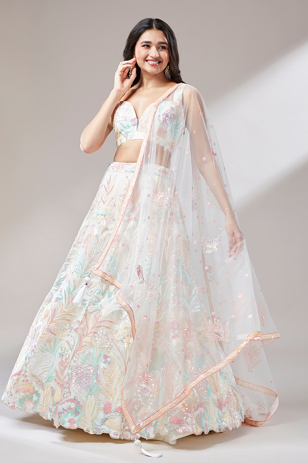 Shimmer and shine in this dazzling Multi-Sequins Work Net Lehenga, designed to make you the star of any celebration. Crafted with fine net fabric and adorned with intricate multi-colored sequin work, this lehenga offers the perfect blend of glamour and elegance. Ideal for parties, receptions, and festive gatherings, it features a lightweight feel with a rich, radiant look. Presented by LaVante Fashion, this statement piece promises both comfort and standout style.