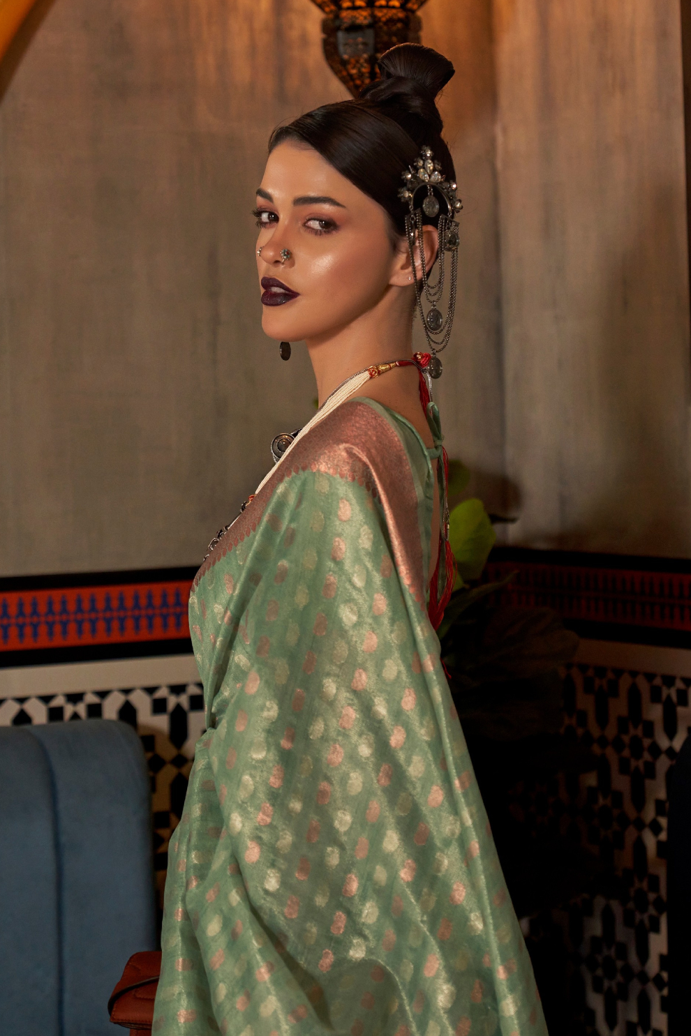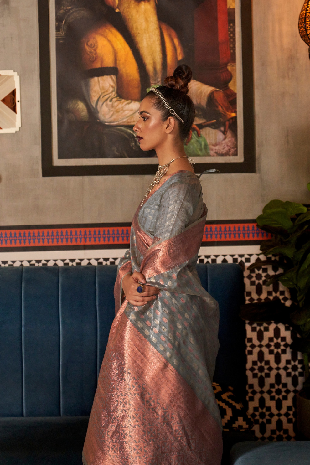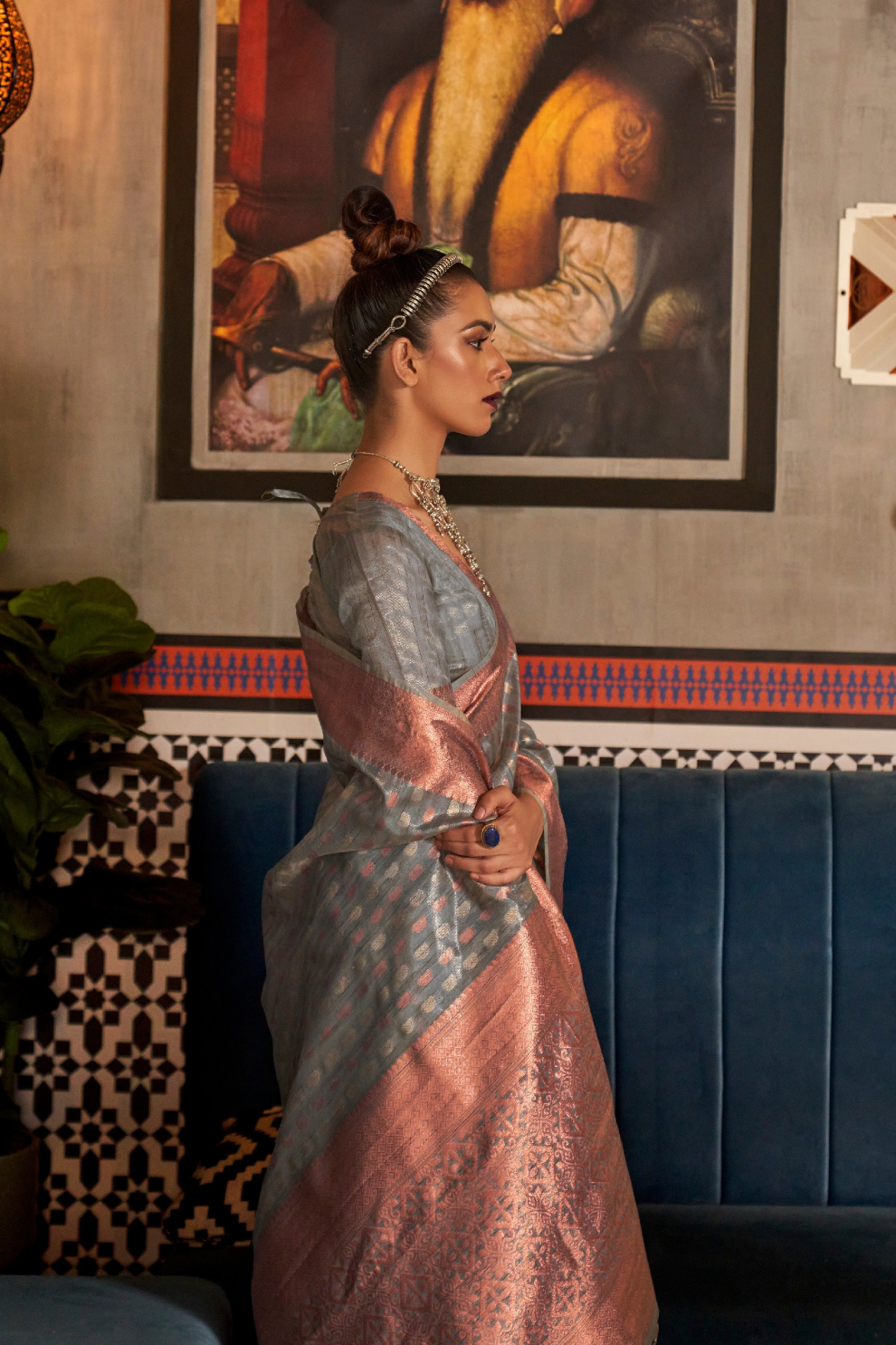 Drape yourself in sheer elegance with this luxurious tissue silk Saree by LaVante Fashion, crafted on a shimmering base intricately woven with copper, silver, and gold zari threads. The handloom artistry showcases timeless finesse, offering a lightweight yet regal drape perfect for festive occasions, weddings, or grand celebrations.
