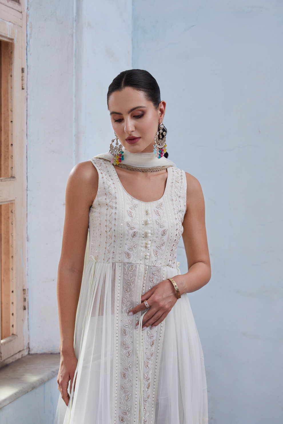 This refined white salwar suit is tailored from premium georgette fabric, offering a flowy drape and breathable comfort. The readymade silhouette features delicate thread embroidery and minimalistic accents, making it suitable for festive events, casual get-togethers, or formal functions. The ensemble presents a timeless aesthetic with a modern finish, enhancing your ethnic wardrobe with effortless charm. Crafted with care by LaVante Fashion, it balances grace, quality, and comfort seamlessly.