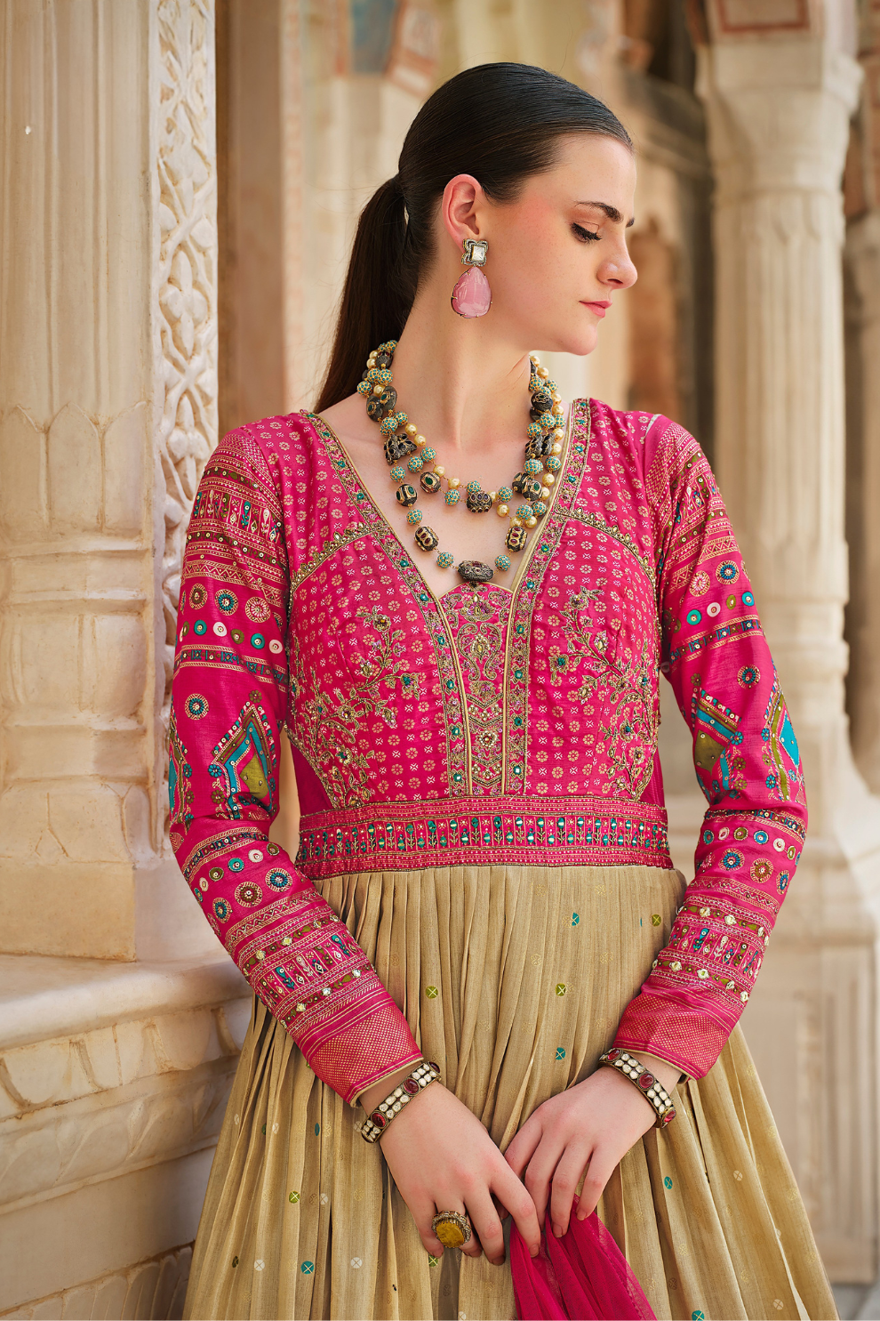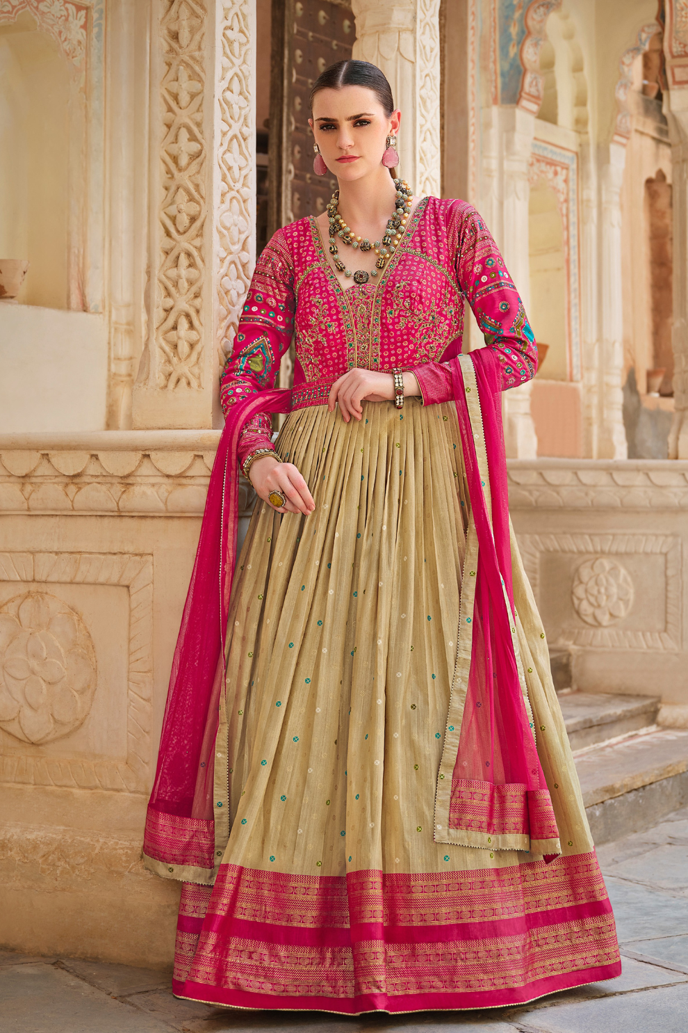 LaVante Fashion presents the Luxurious Cream Silk Gown, designed to bring elegance and sophistication to your special occasions. Crafted from premium silk, this gown features exquisite foil print work that adds a subtle shimmer and artistic flair. The creamy shade complements a graceful silhouette, perfect for weddings, receptions, and festive celebrations. Lightweight and comfortable, this gown effortlessly blends traditional charm with contemporary style.